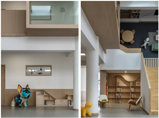 幼兒園設計裝修之墻面裝飾能起到保護墻體、延長使用壽命的作用,也能使室內空間美觀、整潔、舒適。奧華選用灰咖楊木墻板和柜體同色進行設計,色系風格一致,為孩子們營造多樣性舒適空間。